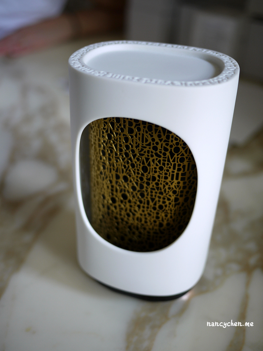 在將包裝左右打開的時刻,突然很像敞開了一座時尚衣櫃,這邊的金色字母一個一個全像跳起舞來,另一邊的白色陶瓷則沉靜地在旁閃閃發光-「un air de diptyque」diptyque首座電子擴香器。優雅的白色橢圓形陶瓷罩,罩著洗練的金屬文字組合而成的擴香機體,裡頭是可以隨心所欲隨時替換香氣的香氛膠囊,散發出再熟悉不過的清新漿果香!