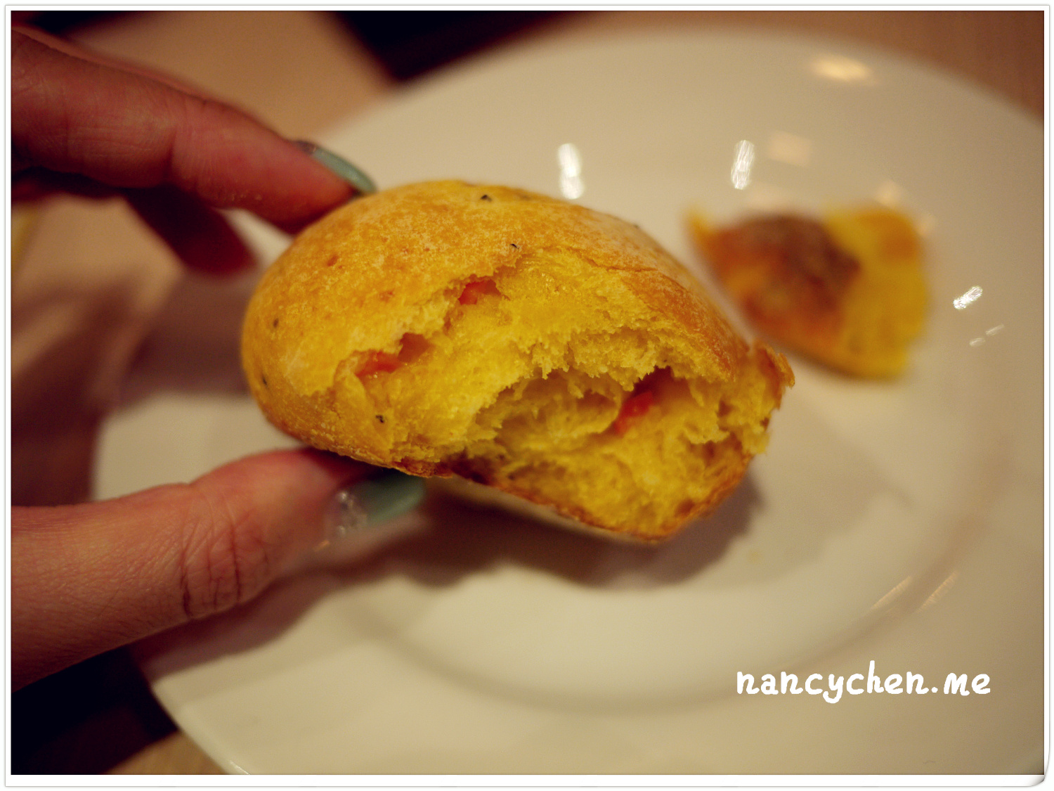 首先是南瓜濃湯與自製的南瓜麵包。我很喜歡他們的自製麵包,吃得出沒有多餘添加物,帶著淡淡的香氣,吃來沒有負擔;我更欣賞他們麵包也要「自家製」的志氣,畢竟現在台北堅持使用自製麵包的餐廳少得可以,這是一種很有豪氣的堅持,我愛。唯一美中不足處是佐麵包的奶油有點少,對於我這個奶油控來說,實在是不太過癮,但也似乎是Les Bébés Cafe & Bar想要人品嚐食材原味的宣言。