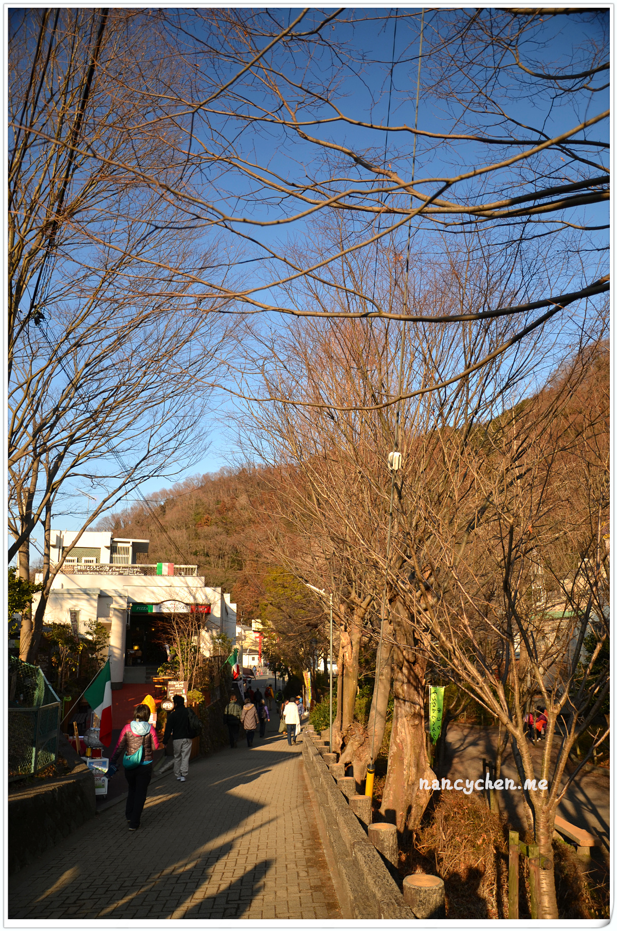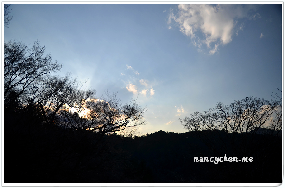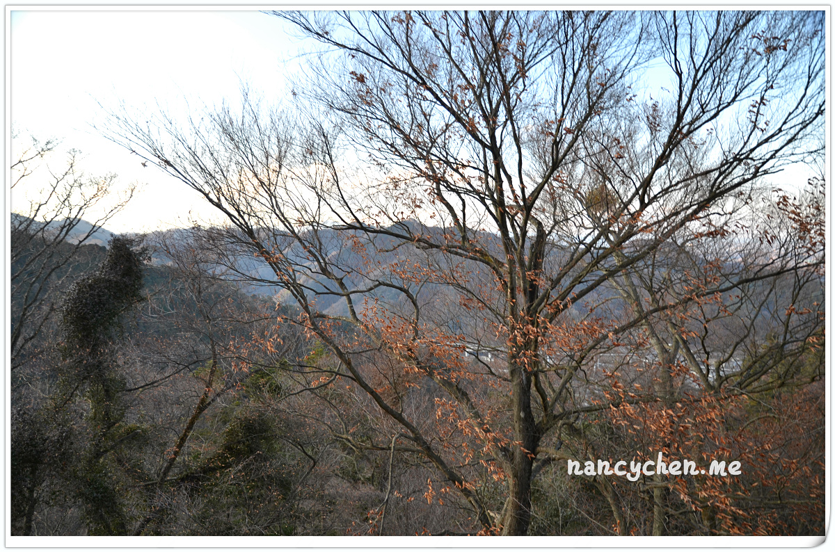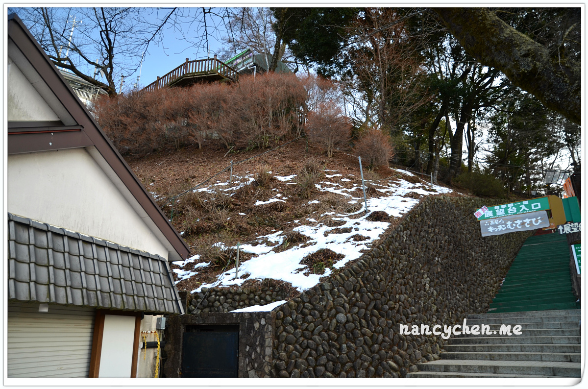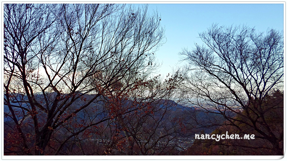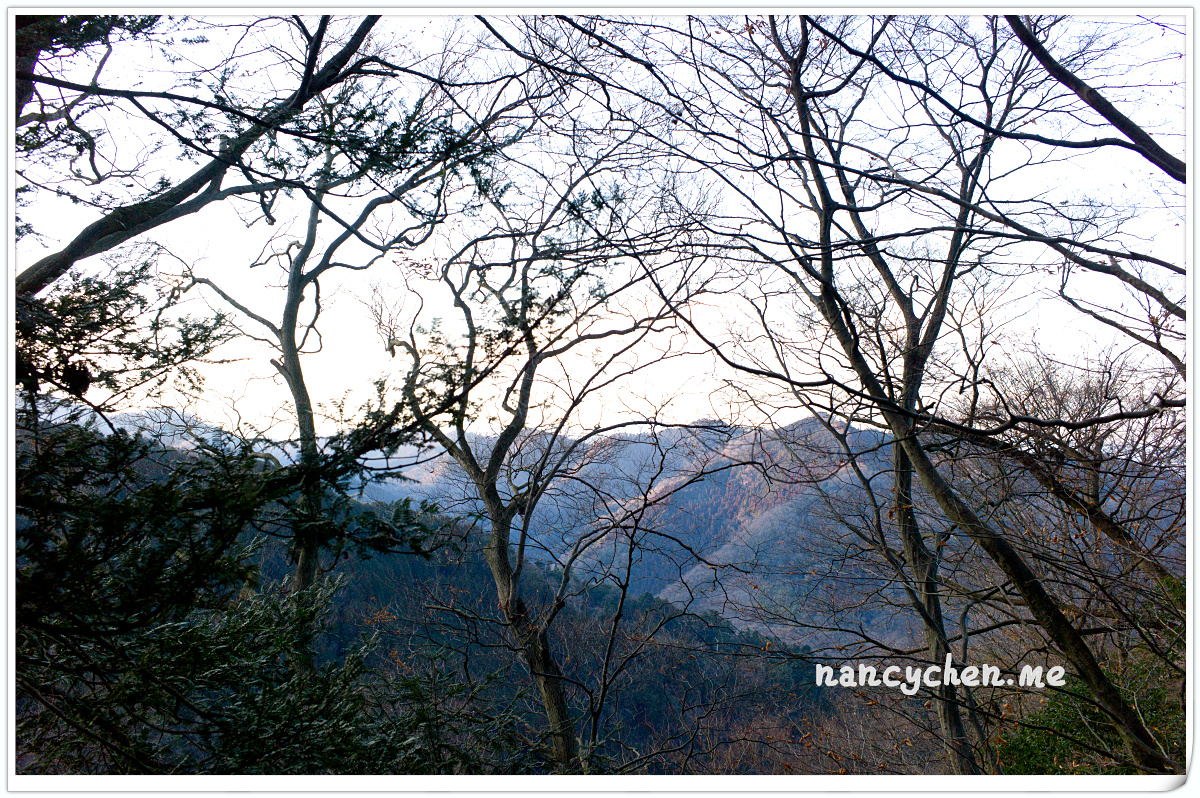 上山的方法有三種,步行、纜車或登山吊車。我們本來想選擇看起來稍有刺激感的吊車,但擔心會失溫所以作罷(哈~),決定搭乘溫暖的纜車上山。沿路盡是高聳的樹林,秋天楓紅時一定很美,但冬天這樣的疏疏朗朗,倒也別有一番滋味。纜車門一開,冷風倏地穿進大家的掌心,趕緊扣好大衣釦子,準備體驗這機會難得的寒冬山間漫步