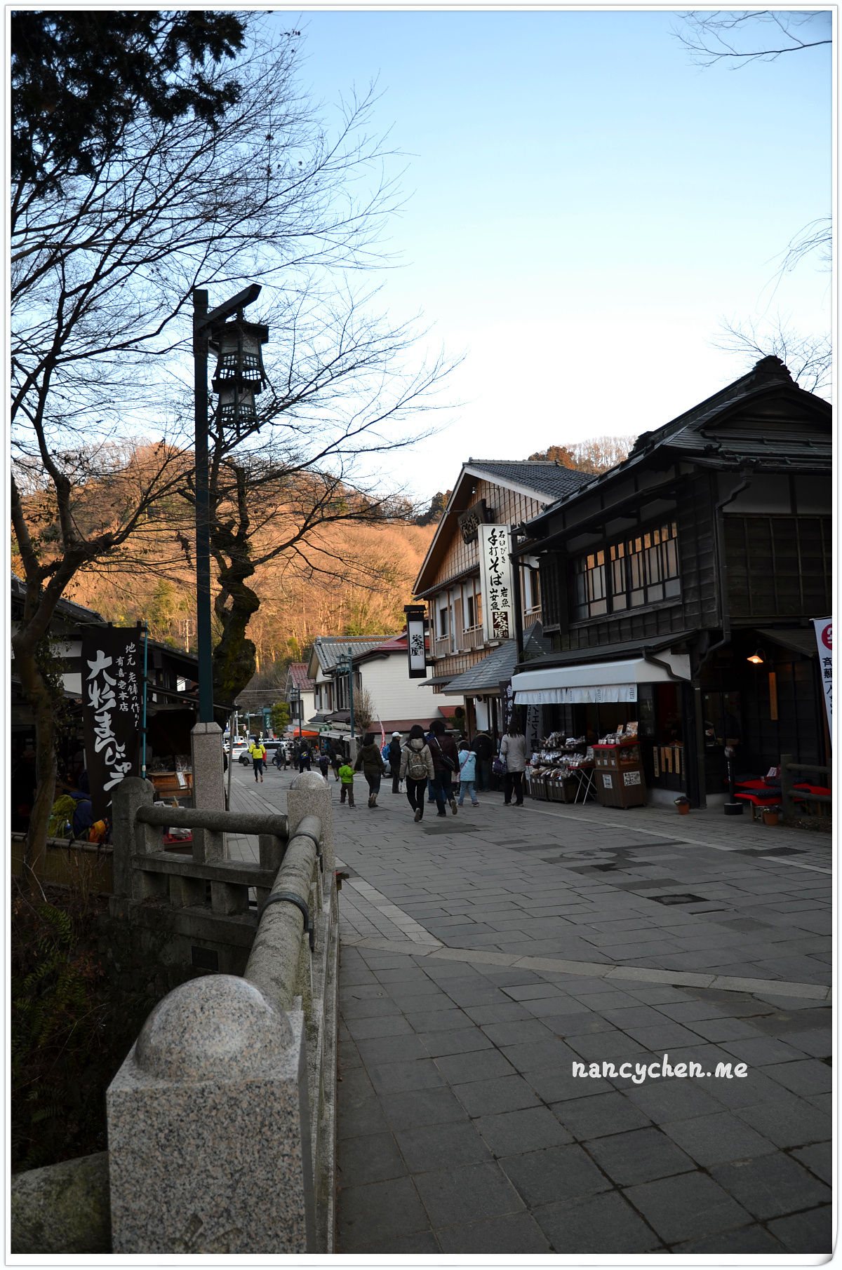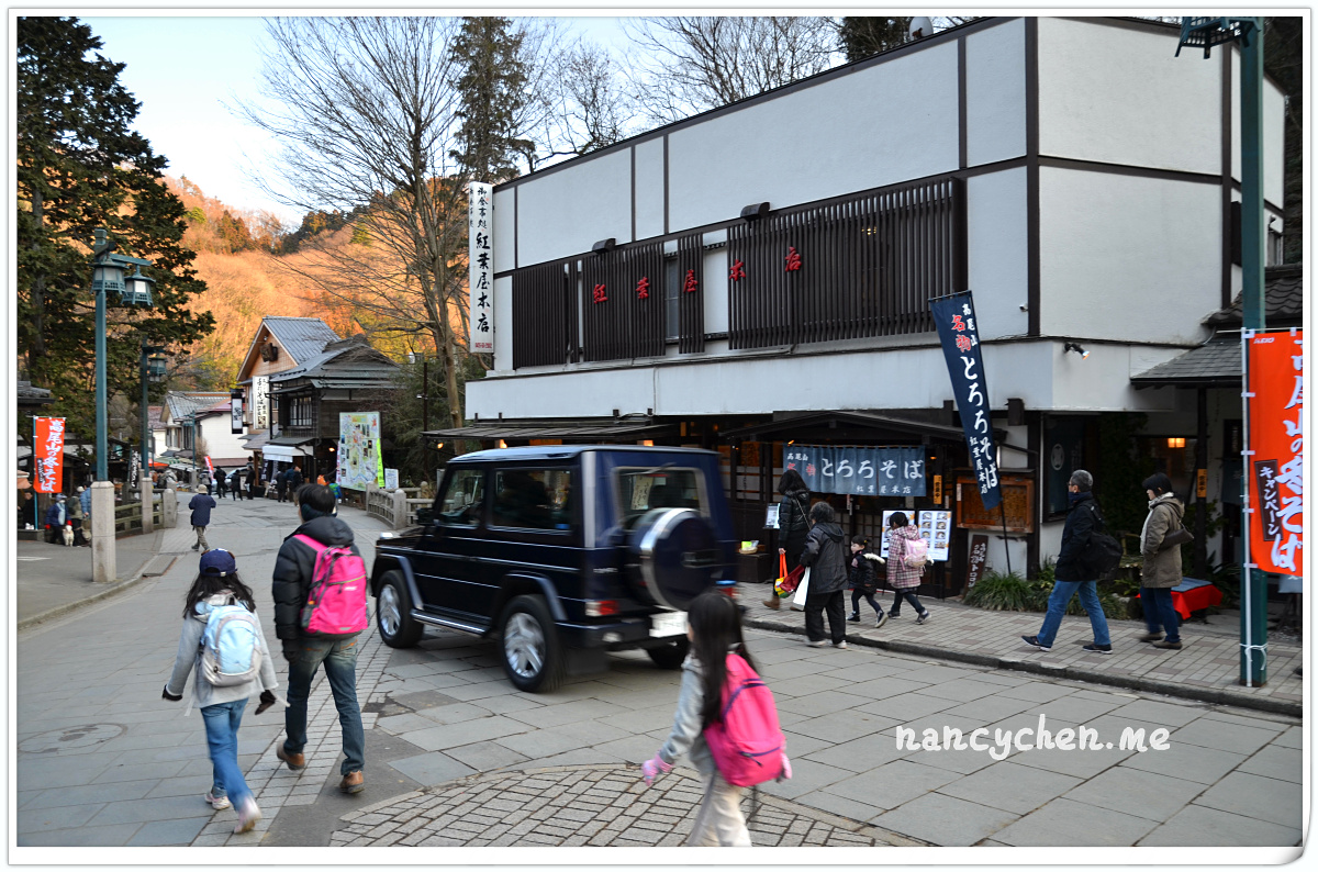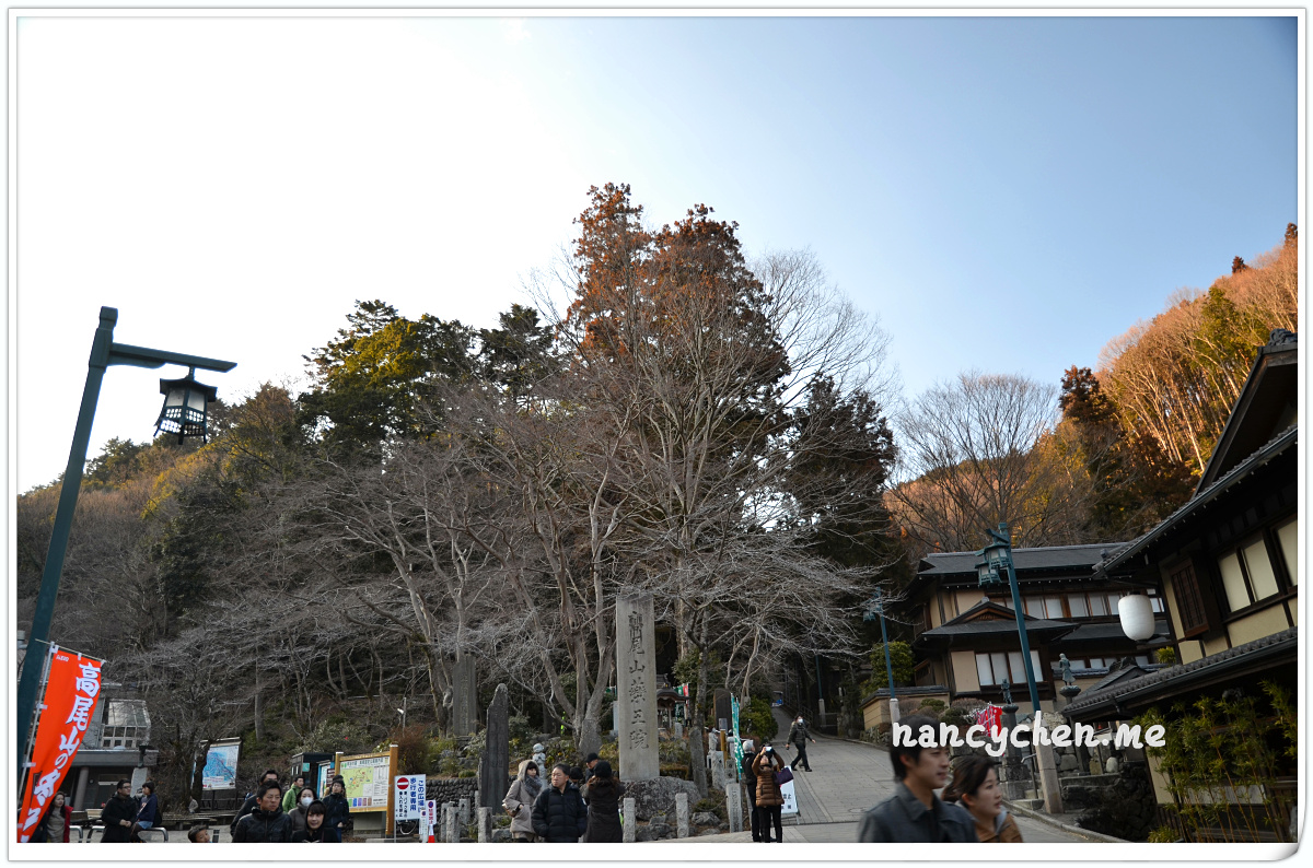 小小的車站,在寒冬暖陽中,顯得特別簡樸可愛。一夥人踏出車站,跟著人潮,眼前全是充滿日式風味的鄉村街景,賣烤麻糬的店主正在高聲叫賣、一邊是遊客坐在店門口的紅色長凳上品嚐著紅豆湯,一邊是門庭若市的傳統蕎麥麵店,還有一根根整齊地隨風飄揚的商家旗幟,好不熱鬧,不一會兒就散步到了高尾山口的纜車搭乘處。
