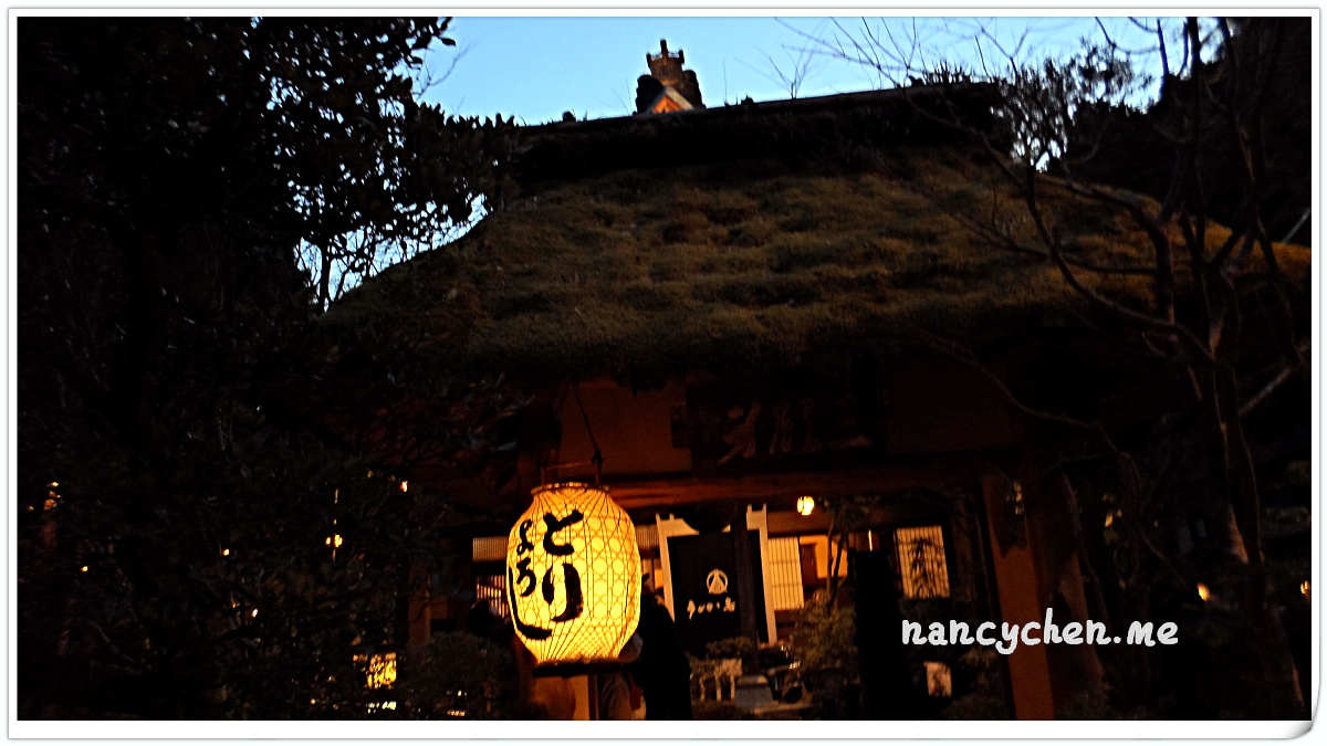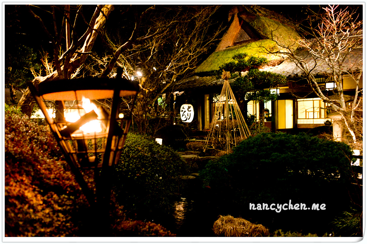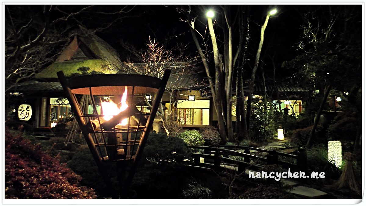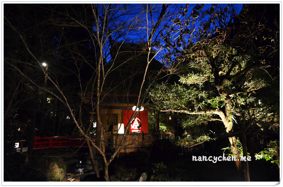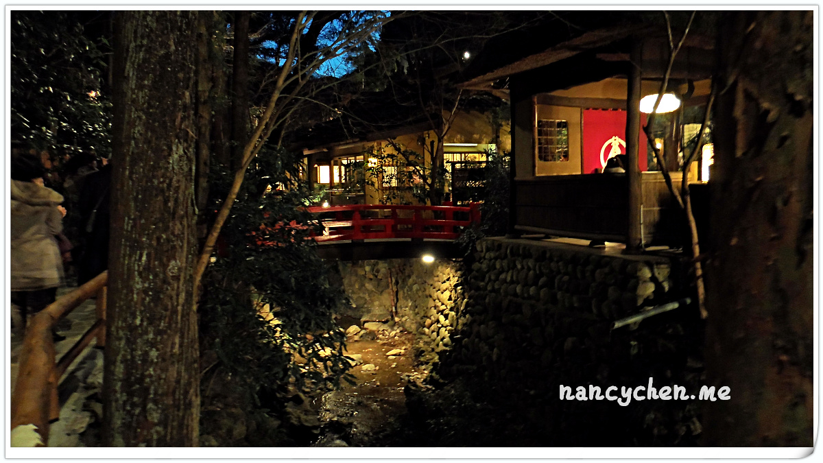 うかい(UKAI)可說是日本很有名的一個高級餐飲集團,而高尾山的這兩間餐廳,據說是うかい(UKAI)集團發跡的起源地,讓人特別好奇它呈現的料理與它擅長營造的極致氛圍。 「うかい鳥山 (UKAI Toriyama)」佔地6500坪,你沒看錯!是6500坪的日式庭園!我們到的時候已是日落時分,庭園裡點起一束束火炬,真有種與事隔絕的不真實感;標準日式庭園造景、小橋流水、還有特別從別處移來的合掌屋,再加上錯落於其中的獨立包廂,走進這個地方彷彿走進時光隧道。