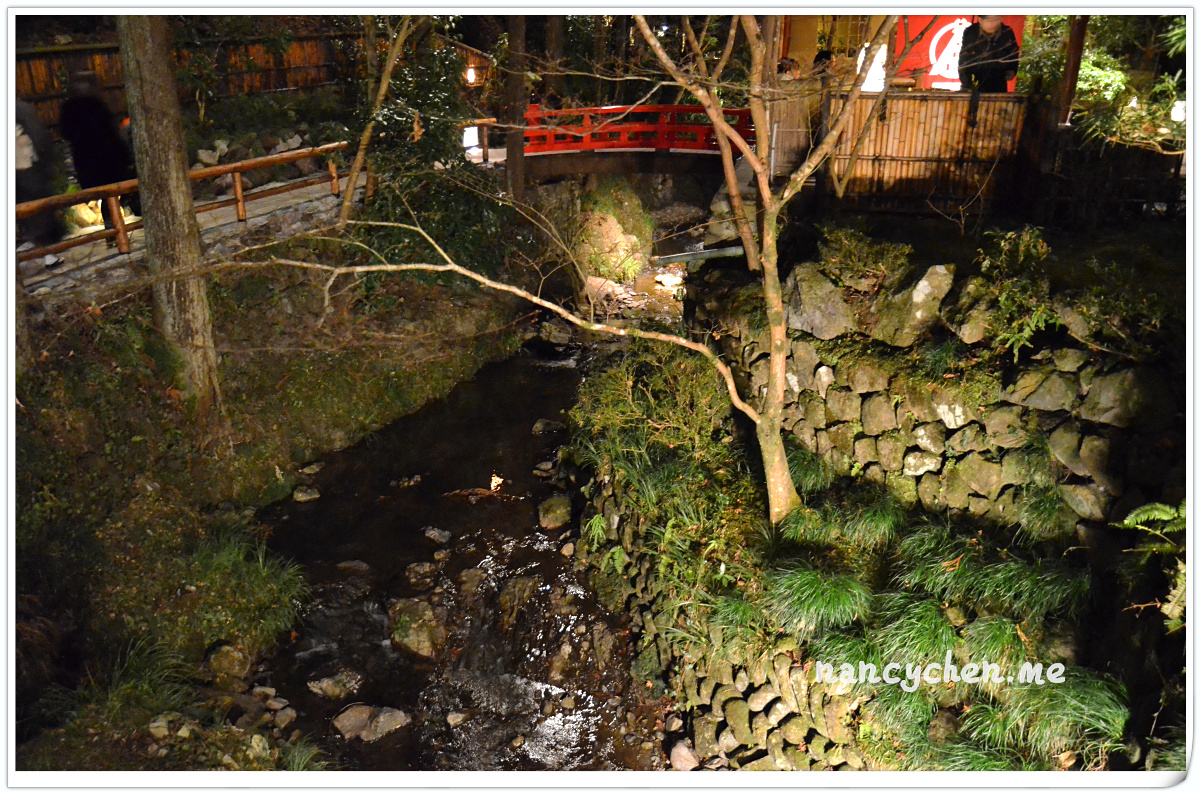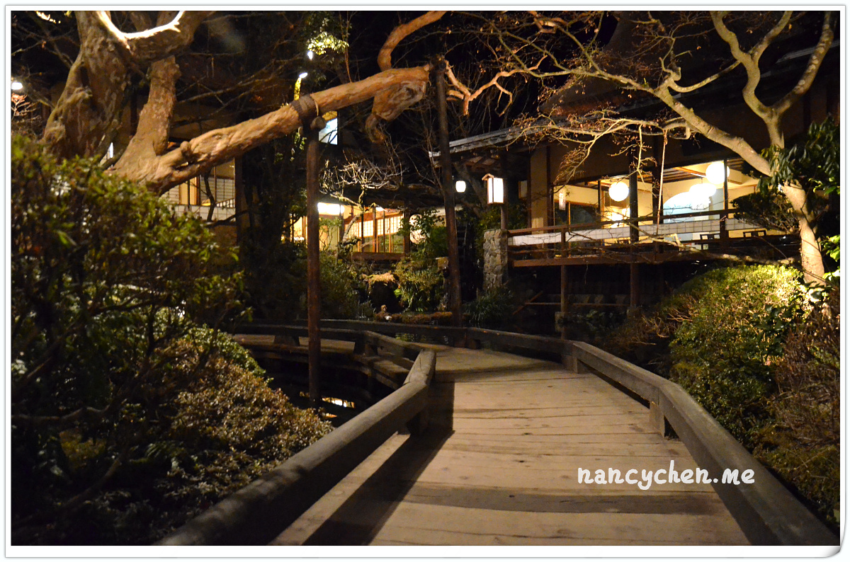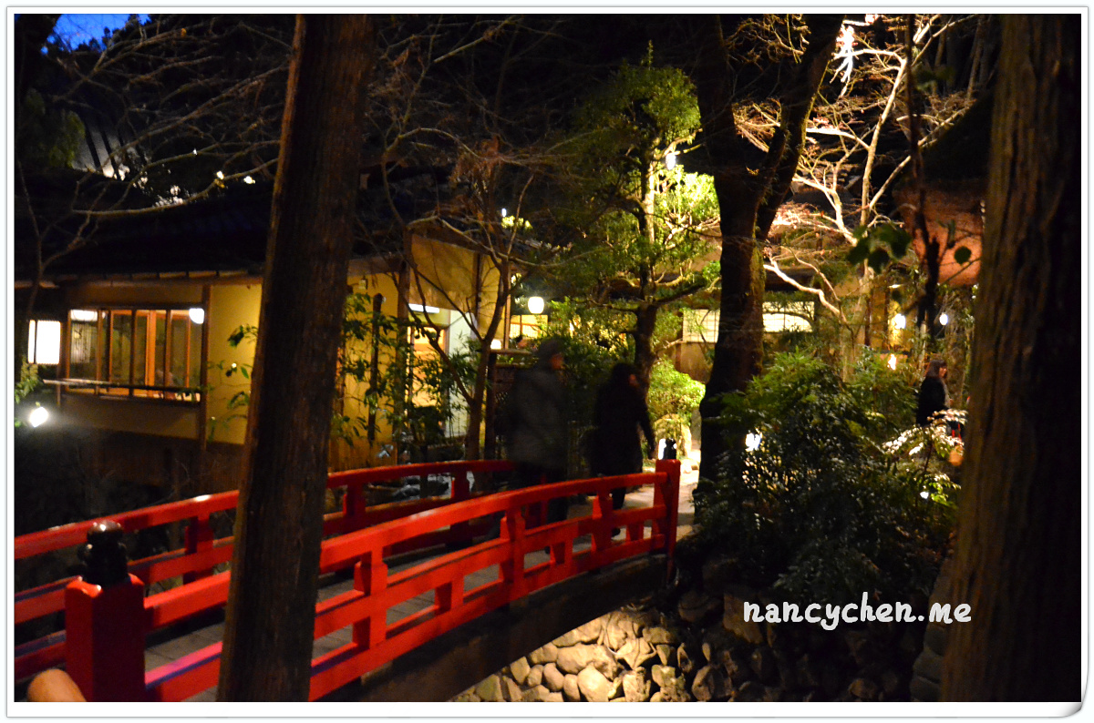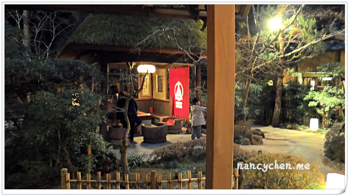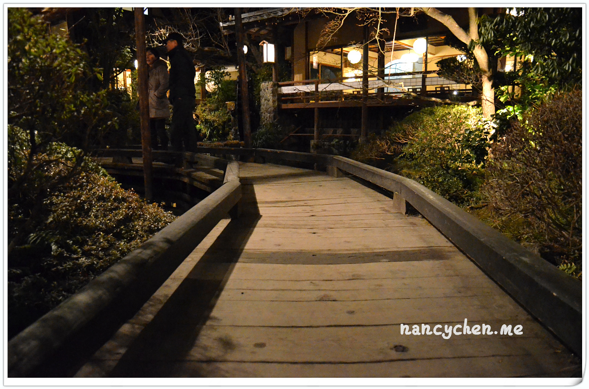 うかい(UKAI)可說是日本很有名的一個高級餐飲集團,而高尾山的這兩間餐廳,據說是うかい(UKAI)集團發跡的起源地,讓人特別好奇它呈現的料理與它擅長營造的極致氛圍。 「うかい鳥山 (UKAI Toriyama)」佔地6500坪,你沒看錯!是6500坪的日式庭園!我們到的時候已是日落時分,庭園裡點起一束束火炬,真有種與事隔絕的不真實感;標準日式庭園造景、小橋流水、還有特別從別處移來的合掌屋,再加上錯落於其中的獨立包廂,走進這個地方彷彿走進時光隧道。