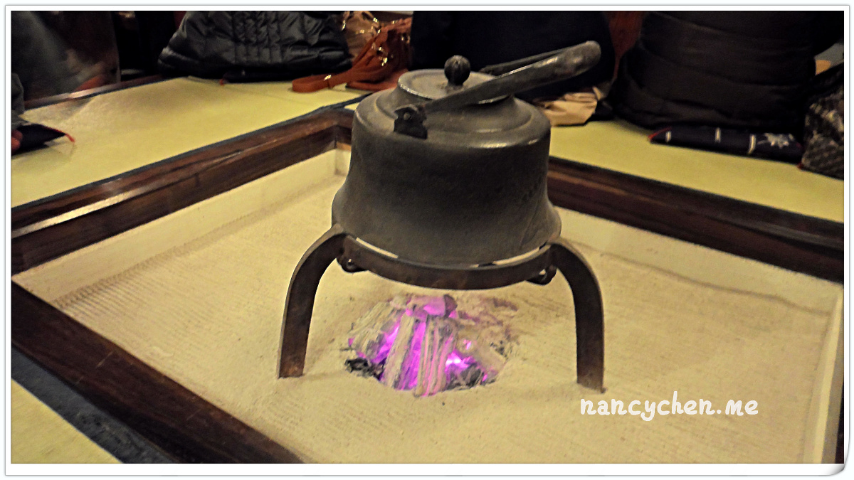接待廳裡是準備大快朵頤的饕客,一個個坐在爐火邊暖手、候位;穿著整齊和服的接待人員遞上一碗熱湯,我們就這麼愜意地享受著寧靜的片刻。很快的,服務人員領著我們,穿越這如夢境般的庭園,越過紅色的小橋、耳邊是潺潺流水聲,來到我們的獨立包廂。包廂三面都是玻璃,我們可以盡情欣賞這般絕世美景。