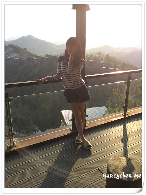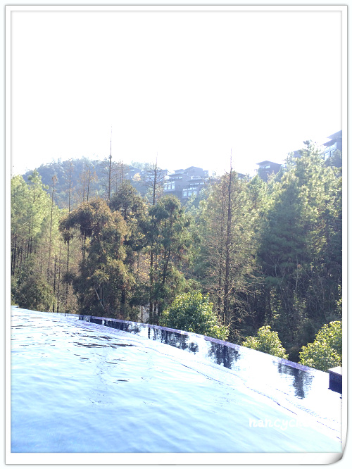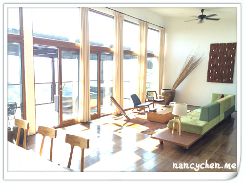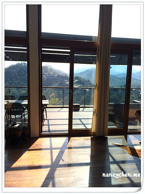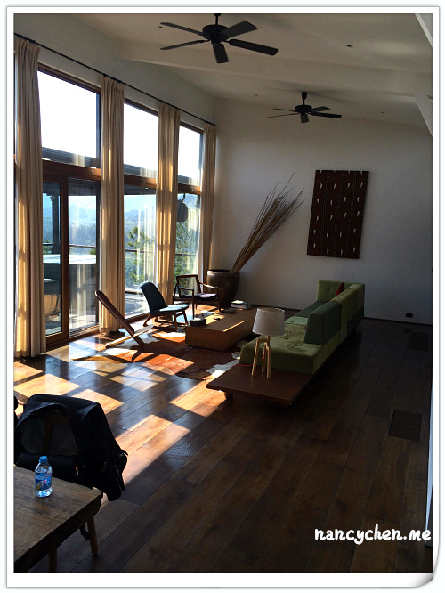 我們的別墅名叫「天鵝」,是位處數一數二高的位置,所以當門一敞開,眾人驚呼連連!寬敞的別墅,挑「超高」的空間,眼前全是落地窗,落地窗外是個大陽台,陽光大方灑瀉,室內也成了金黃色的;連綿的青山在眼前一字排開,一眼望去盡是盎然綠意,萬里無雲的好天氣,更像慶祝著我們的到來,那樣燦麗可愛。