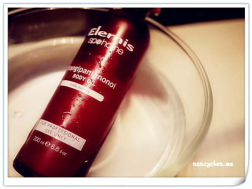 ↑ Elemis雞蛋花身體潤膚油的使用方法很特別,因為它在低溫狀況下會凝結成塊,所以使用前必須將產品放置於溫熱水中,使之回復至液態。我通常都是泡澡時就先把它整罐豪邁地丟到浴缸裡(蓋子請蓋緊),這樣就很方便沐浴後直接使用喔!