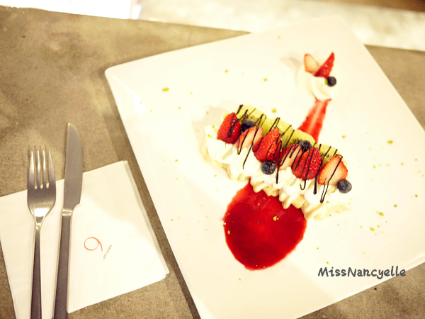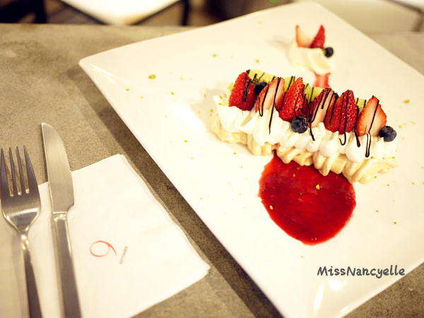 為了襯托柏可尼霜餅的口感和甜度,September Café 選擇了爽口的草莓、藍莓、奇異果增加層次,再以質感細緻、嚐來一點都不甜膩的鮮奶油慕斯,不搶戲地讓霜餅入口融化後更加綿密;華麗襯底的新鮮莓果醬,不僅讓視覺震撼,更適度提高了整道甜點的酸度,酸味能適度刺激味蕾,更能降低甜點的膩,讓人吃到最後一口仍覺得意猶未盡,好吃極了!!!!!!!!!!!!!!! (尖叫♥)