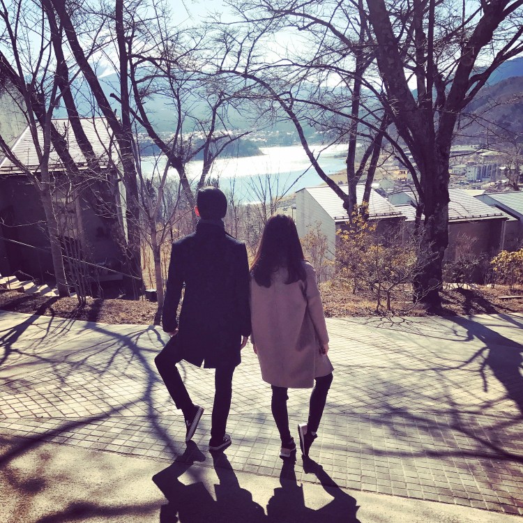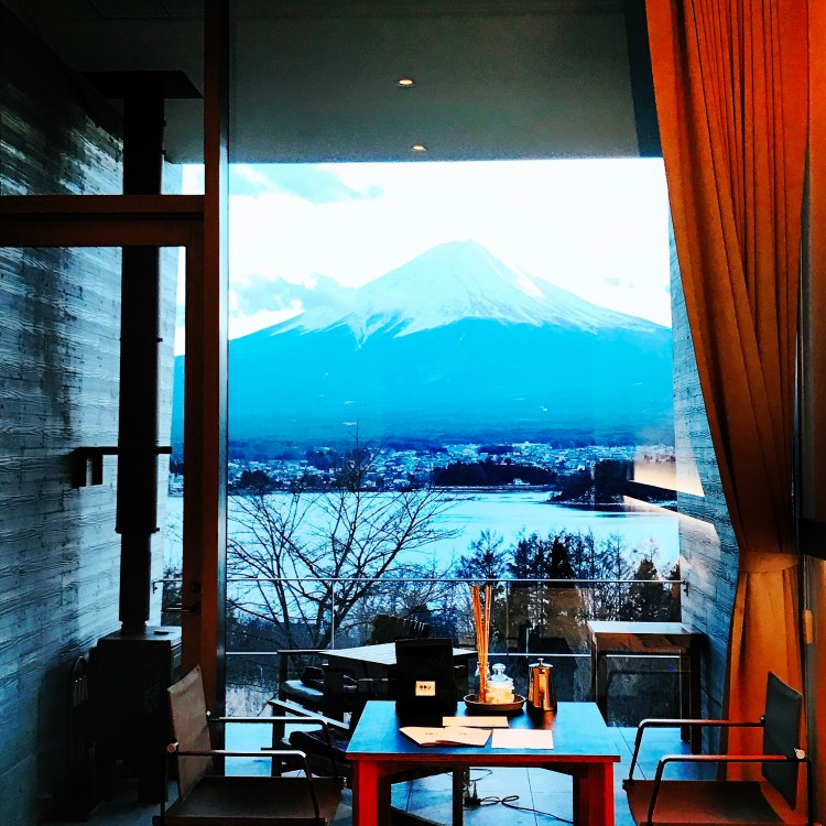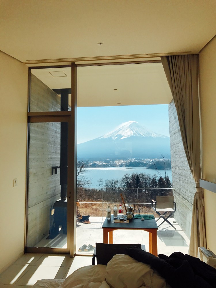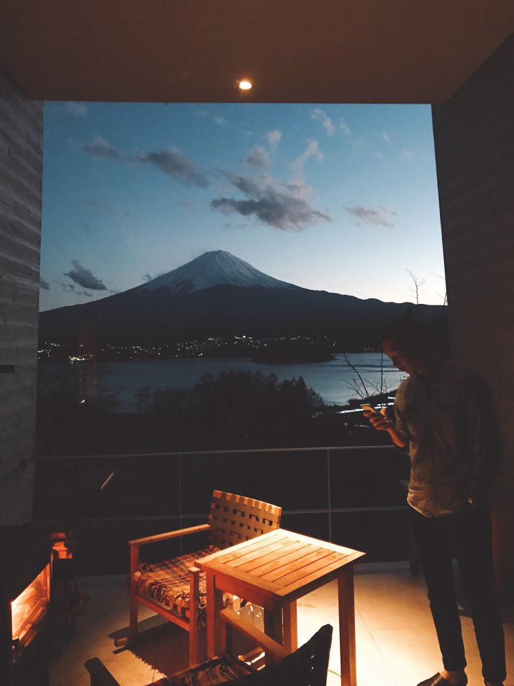 接下來的兩天,我們都盡量待在房間裡,幾乎要捨不得出門。在富士山與河口湖的陪伴下,把手機連上音響,播喜歡的音樂,看書、發呆、聊天。天氣再冷,我們也總待在露台上,看24小時的光影如何在富士山上流動,有時還有雲,像是給富士山戴帽子那樣。每個時間的景致都不一樣,那一種無所事事其實意義非凡,滿足了我們心裡始終需要的平靜與浪漫。