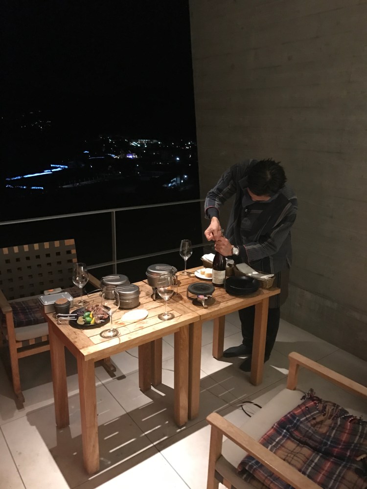 我們在房間的露台上吃晚餐,第一天吃「露營餐」,有熱騰騰的咖哩、烤蔬菜、牛肉陶板燒、各式小菜,配著紅酒,很有滋味;第二天則嘗試了飯店人員極力推薦的「鹿肉火鍋」(但我實在不敢吃),配著各式山菜,還有一瓶在地清酒,也盡是享受。一旁是巨大的富士山、開闊的河口湖,天氣很冷、火爐很熱,只記得當時一心想把那時那刻的味道吃進心裡,有美食美景,有家人時常在一起,之於我,就是最美好的幸福快樂。