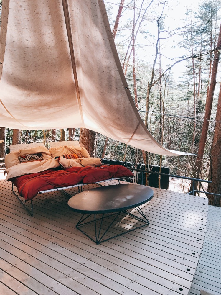 從東京搭火車到河口湖車站,接著轉乘計程車,沿途都是寧靜優美的河口湖景致,還有壯觀的富士山。Check in時,飯店會讓你選一個露營用的背包,裏頭都是露營必備的東西,比如望遠鏡、戶外頭燈、水壺、小餅乾等等;在你拿到包包的那一刻,坐上接駁的吉普車,就真的像準備好了出發露營的心情,讓我們這些麻木的大人,重溫校外旅行前的那種可愛的期待與興奮。