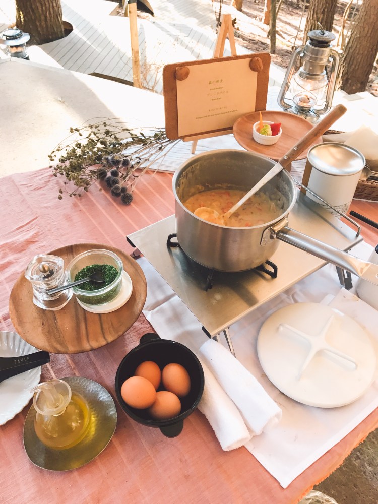 兩天的早餐都很有特色,第一天在玻璃屋裡吃烤得又圓又蓬鬆的麵包,配上許多西式口味,生菜沙拉、烤蛋、培根香腸等等,氣氛和服務都很舒服。第二天,我們特別起得早一點,沿著長長的階梯往上爬,參與了樹林裡的自製早餐體驗,自己烤麵包,然後把濃郁的馬鈴薯濃湯加進去,放進滿滿配料後,再放進烤箱裡烤。我們找了個帳棚下的位置,佐著現煮咖啡,享受樹林裡愜意的早晨時光。