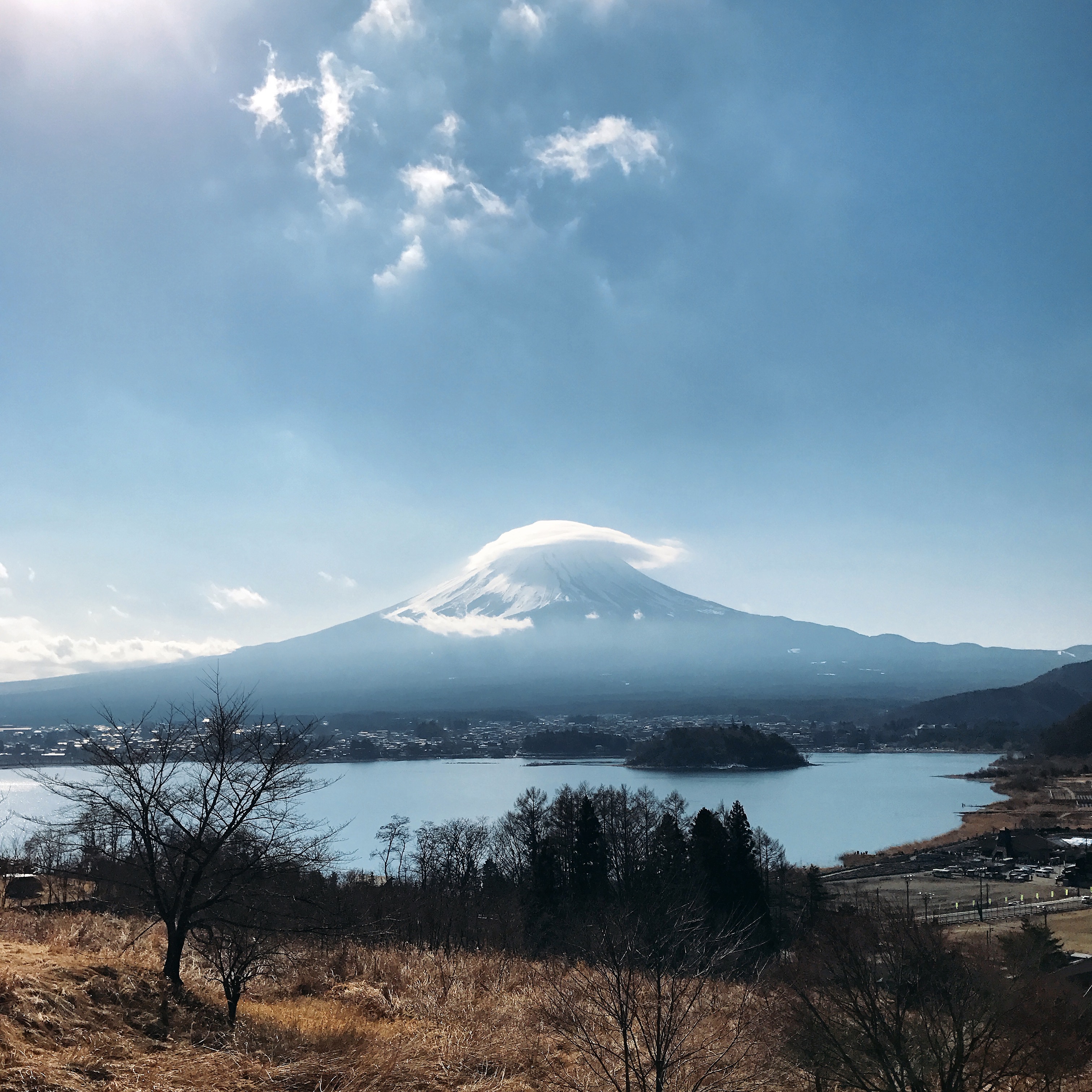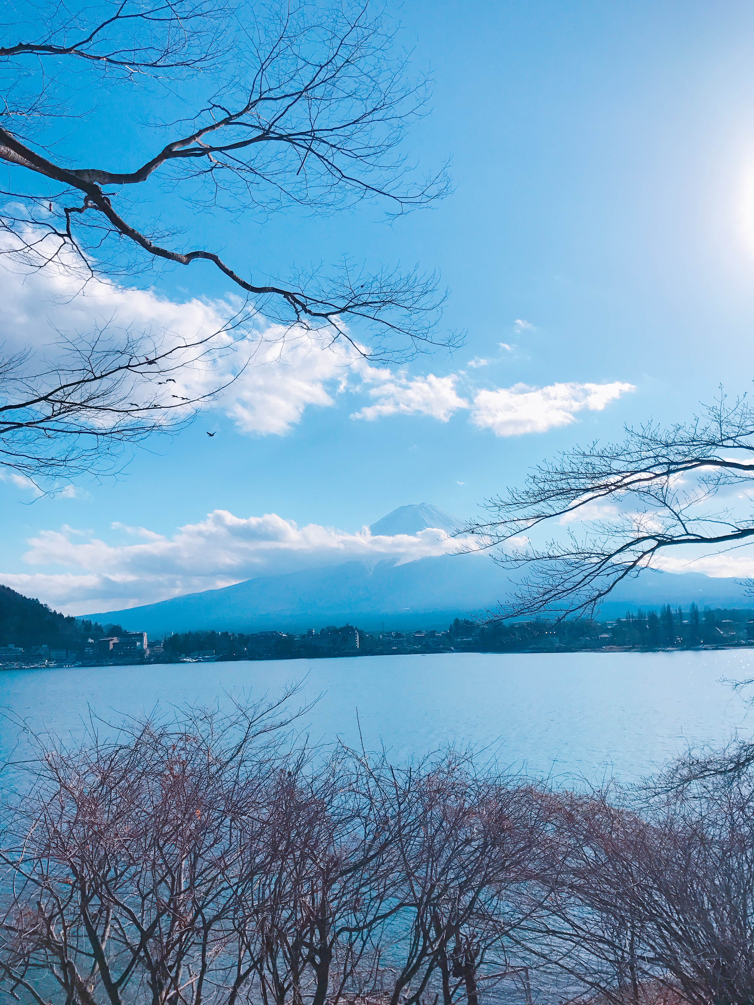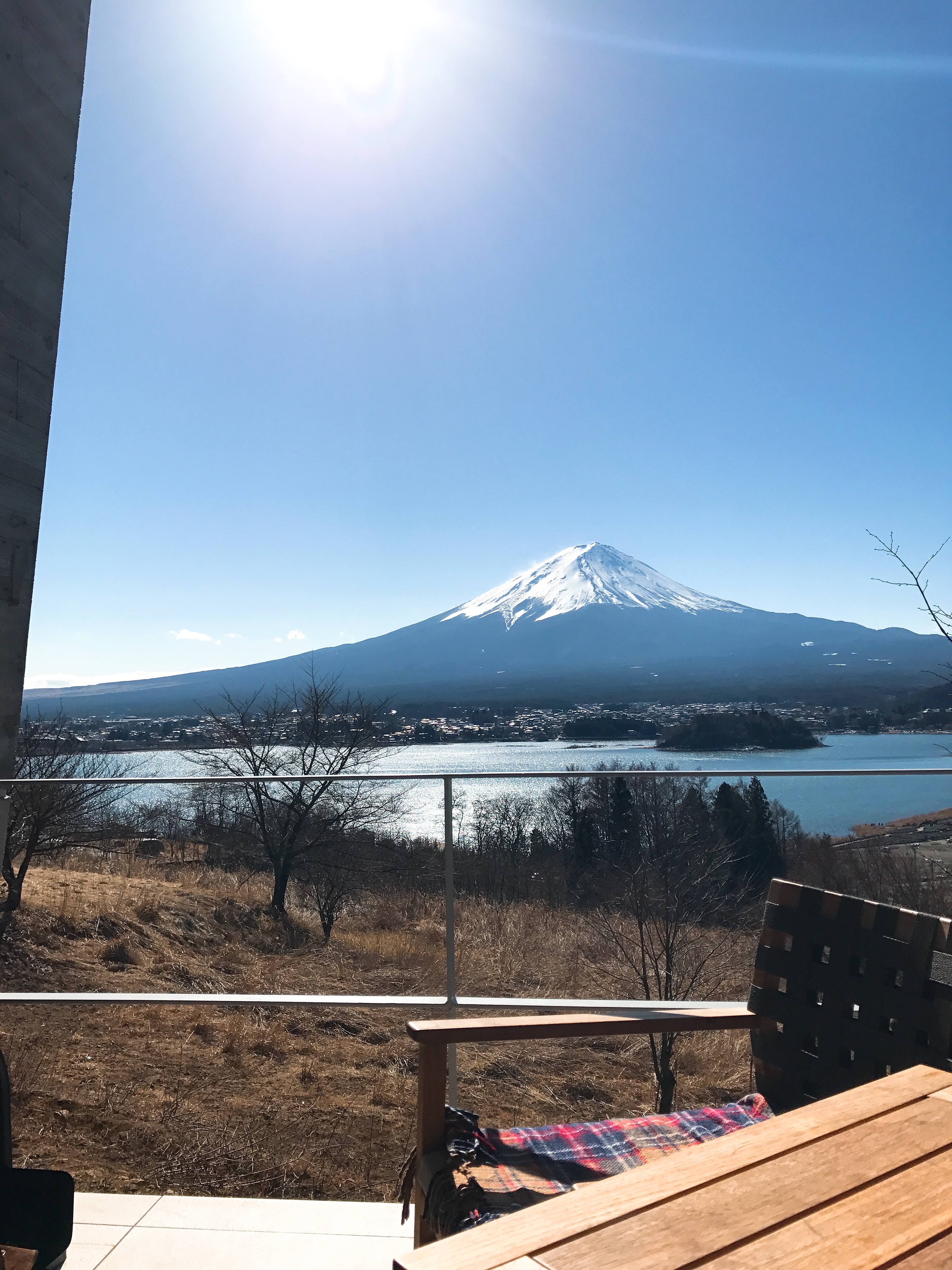 接下來的兩天,我們都盡量待在房間裡,幾乎要捨不得出門。在富士山與河口湖的陪伴下,把手機連上音響,播喜歡的音樂,看書、發呆、聊天。天氣再冷,我們也總待在露台上,看24小時的光影如何在富士山上流動,有時還有雲,像是給富士山戴帽子那樣。每個時間的景致都不一樣,那一種無所事事其實意義非凡,滿足了我們心裡始終需要的平靜與浪漫。