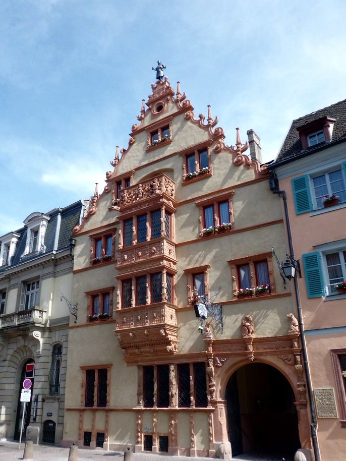 La Maison des Têtes譯作「人頭屋」,建於1609年,座落於同名街道上,街道14世紀即存在。山型牆面上共有描繪賣藝人物臉孔的105個人頭雕刻(也有一說是面具),屋頂上方的青銅像則為自由女神像設計師Bartholdi巴多爾迪的作品,被譽為德國文藝復興時代代表建築之一。(柯爾馬小鎮其實藏著許多巴多爾迪的作品,因為這裡正是他的出生地。)