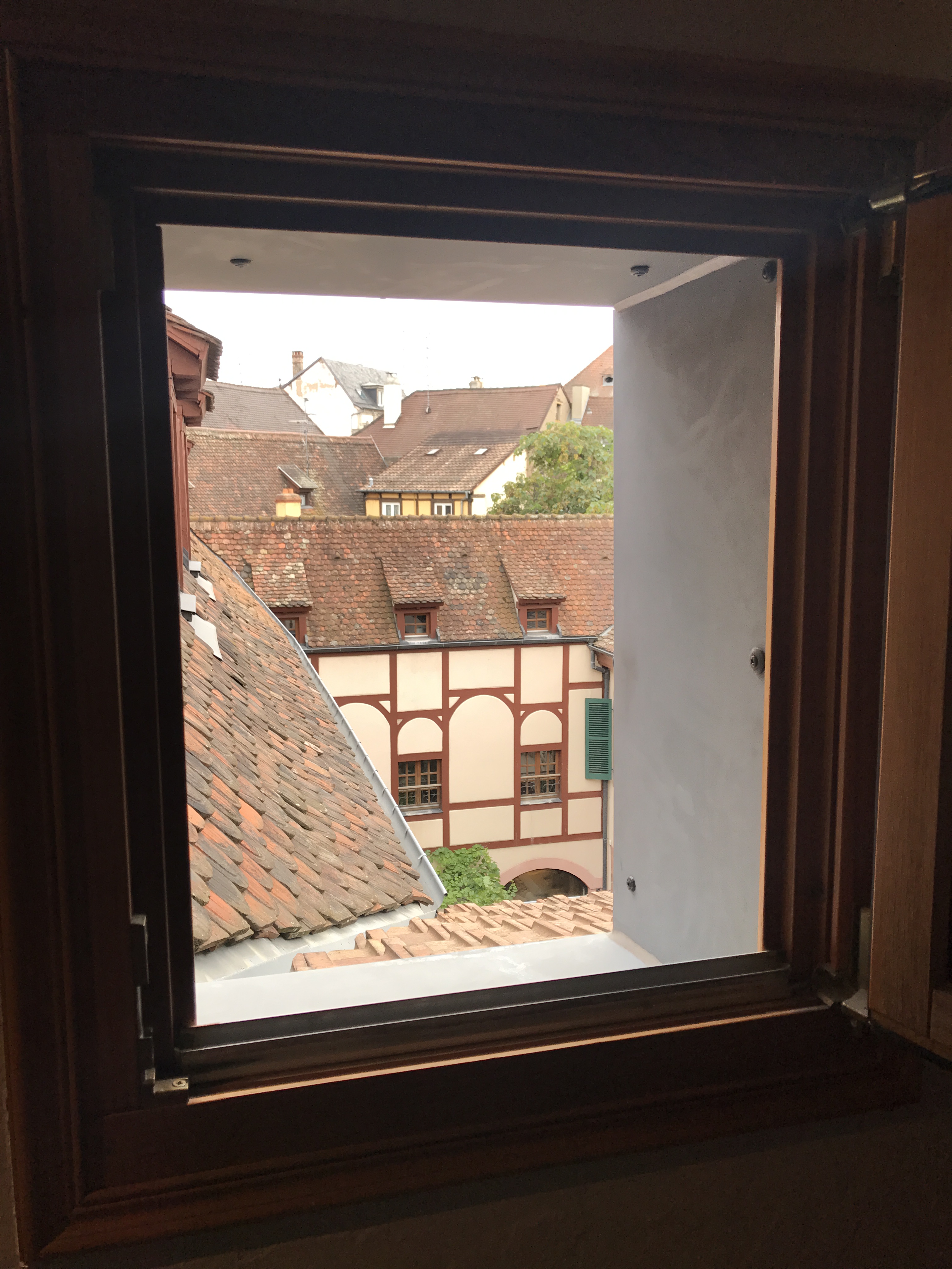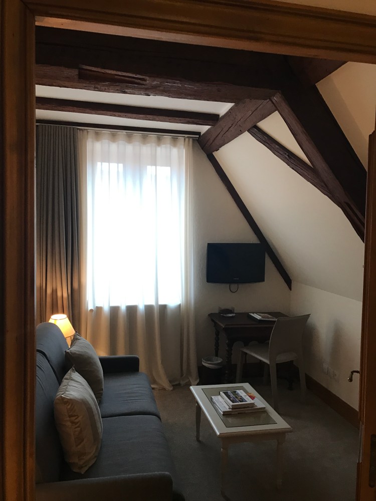 這個地標級建築物以前作為葡萄酒交易與集散中心,現在則保留建築外貌,改為旅館和餐廳。我們就這麼住進了這麼悠長歷史的建築物裡,大廳布置得很簡潔現代,大方卻親切。心裡還輕飄飄的,跟著被領進了我們的房間,原木樑柱,看似撐過了無數歲月,小而五臟俱全的空間,很是溫馨。閣樓的位置,則讓我們能浪漫俯瞰這個迷人城鎮。